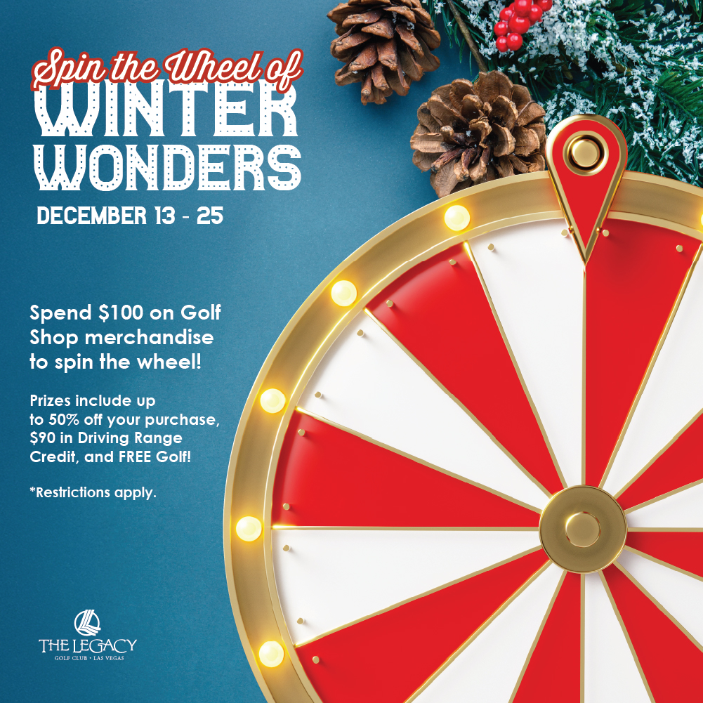 Spend $100 on Golf Shop merchandise to spin the wheel! Prizes include up to 50% off your purchase, $90 in Driving Range Credit, and FREE Golf!