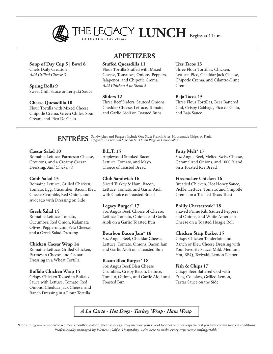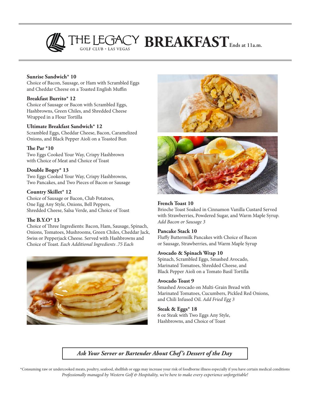 There is something for everyone at The Legacy, including those who do not golf. Come visit The Grill @ Legacy for a full-service casual restaurant with bar and patio! Serving traditional American style cuisine, our menu has familiar favorites from savory burgers to fresh salads. The Grill serves breakfast and lunch 7 days a week. Now is your chance – come experience delicious food paired with beautiful views from your new favorite spot.